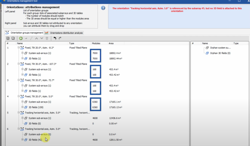 In your print screen you see all the details of the number of modules in each sub-array and each table assign to the defined orientations. The difference between your print screen and the video is that the folders are collapsed. Click on the small minus icon collapse the folder and see the total of modules in the system/3D scene for each orientation. If they do not match, you need to add/substract the modules defined in the 3D scene, or in the system.