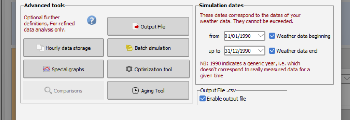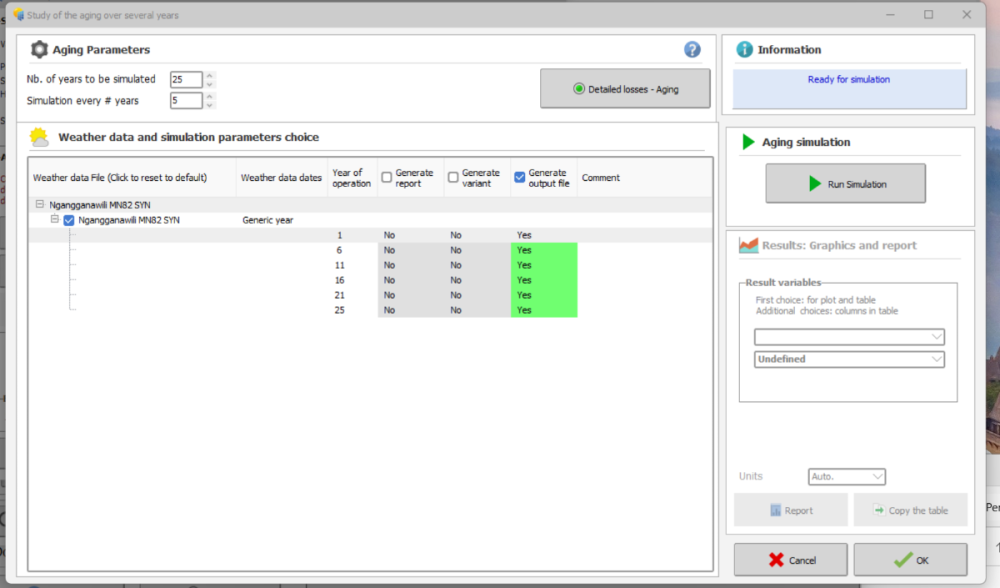 Hi, I have modelled a solar farm installed 5years back and factored in the yearly degradation rates in the detailed losses>>aging section and enabled output file generation as attached below. For some reason, when I run the advanced simulation, it returns only Y1 E-grid values. How do I generate an output file with the hourly E-grid values for the current year, and later years? Thanks, Tonderai.