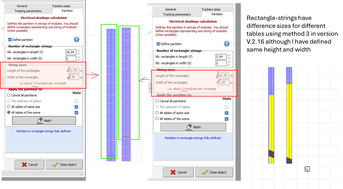 Dear Jianguo Chen, Thank you for your feedback. I share your understanding : both dialogues, with those parameters, should lead to the same results. For me the correct plot is your top screenshot, from the menu "One shaded Module". I noted that this problem seems to happen only with "Twin-half-Cut" module: If I select a "In length" module, both dialoguess give me the same results I think therefore there is a problem with the calculation of the electrical layout in this specific dialog. I will create an issue to investigate it further and fix this problem in a future version. -