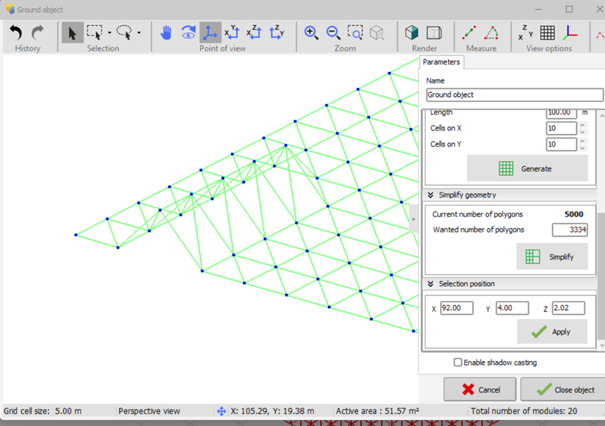 2. Hello. There is the posssibility to raise specific points in the 3d construction on the ground to immitate slopes. Maybe we could use this feature to create a sloped surface (immitating a reflector) in order to see if its possible to increase bifacial efficacy. Is that possible? I am currently working on my thesis to compare specific performance improvement methods for photovoltaic systems, and one of them is to add a special reflector with an albedo of 0.7 behind a PV table. This reflector is impossible to be added in PV syst and therefore I am trying to immitate it.