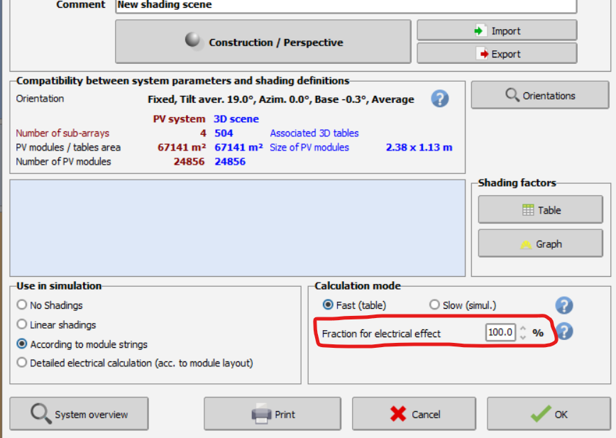 Hello, does someone know if it makes sense to decrease the "fraction for electrical effect" percentage (i.e. from 100% to XX%) to take into account the supposed better behavior of BC modules (Longi, Aiko, ...) in terms of electrical mismatch induced by 3D scene shading (for a utility-scale PV plant)? A manufacturer proposes to set the fraction to 70% according to its investigation and some laboratory tests by TUV, but I'm not sure they can completely trusted. Did anyone encounter the same issue/doubt? Does PVsyst team have any suggestion on how to handle this in PVsyst (if possible) and if make sense to set to 70%? Hope to have any feedback. Kind regards Michele