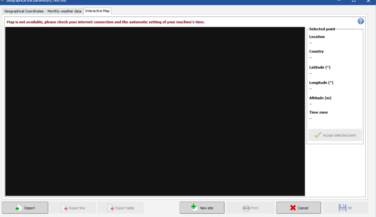 Dear PVsyst Team, While importing new geographical site parameters, it is not able to locate the site in the geographical site parameters tab; the map becomes black and is not able to locate the site location. Is this a bug or anything we need to change in PVsyst to make it like before?