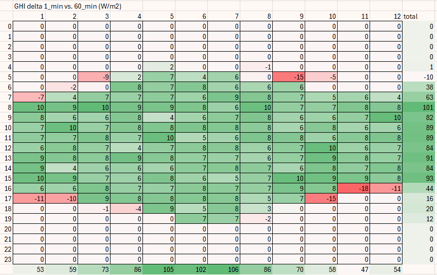 Hello Michele - I had a similar thought so I compared the GHI total (from the weather input files). Is this what you were meaning? It could be possible this is all due to the rounding effect noted by the satellite weather data provider. 1-minute total: 1759.7 kW/m^2 60-minute total: 1758.8 kW/m^2 I also looked at it this way to see if there were any obvious patterns: -
