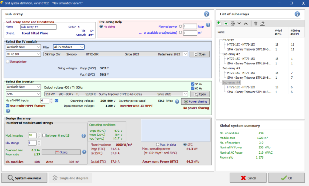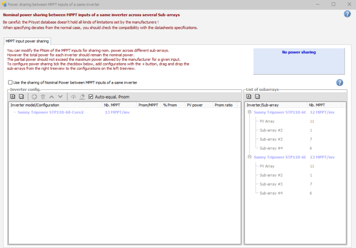 5. There is a existing project that I need to make a simulation using pvsyst. The inverter is sma sunytripower 110. i understand that I need to make subarrays to make simulate different no of strings in 2 different inverters. but in power sharing tab, there is plus sign to add a different configuration is not green and inactive. How to I fix it? Or am I doing it wrong?