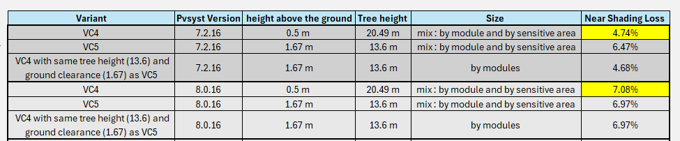 I ran the same variant in PVsyst 8 and got a huge difference in near shading loss. Does it make sense? please see the highlighted cells below. the only difference between two is they were ran in two different versions: -