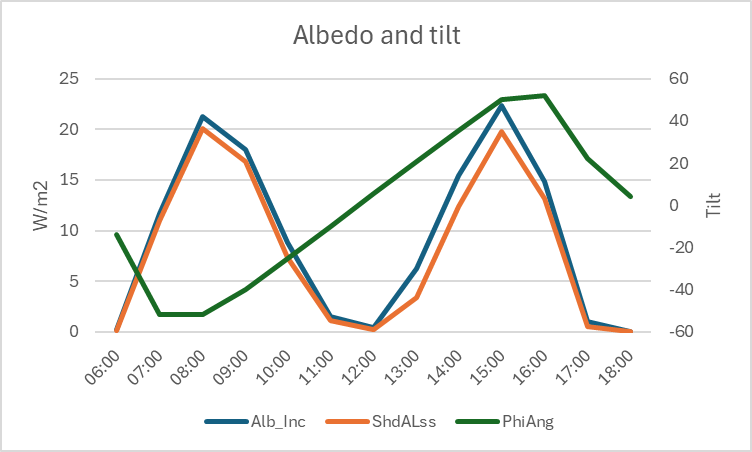 Hi, how is the albedo shading component (ShdALss) calculated? I have read the help pages on this topic but i am still not clear how this functionally works, sorry. https://www.pvsyst.com/help/project-design/shadings/calculation-and-model/index.html https://www.pvsyst.com/help/project-design/shadings/calculation-and-model/treatment-of-the-albedo-component.html#far-shadings Why does the albedo shading loss have this profile on a clear-sky day (single-axis tracking system): ? TIA