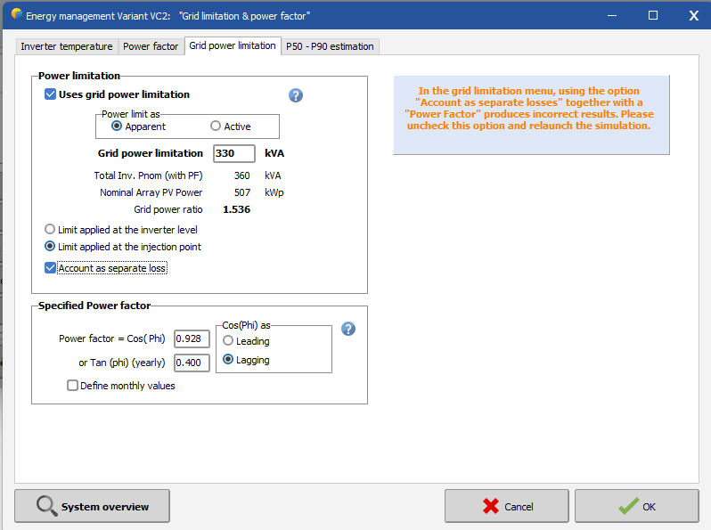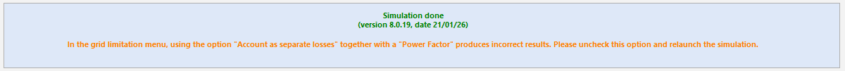 Grid Power Limitation: The option "Account as separate loss" in the menu grid power limitation poses a problem when used together with a power factor. Indeed, at the moment, the reactive energy produced is computed based on the available energy at the output of the inverter. When a grid limitation is present, this is acting normally as a clipping loss on the inverter, therefore the available energy at the output of the inverter is reduced and so is the reactive energy. However, when the option "account as separate loss" is used, the energy at the output of the inverter is virtually higher, causing a miscalculation of the reactive energy. It depends on the magnitude of the grid limitation, so we recommend users to check their simulation with and without this option to decide whether or not to use it. Until the opton is fixed in a future version, the software will display a warning when both options are used together.