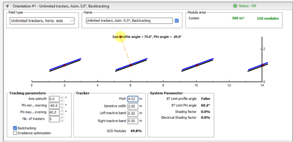 Hello, I'm comparing the tracking angles from a simple PVSyst simulation with the tracking angles given by pvlib.tracking.singleaxis(), and I expect a very similar result between them. I do get a near-perfect match during the middle of the day, however I see the angles deviate significantly during backtracking times. The angles match only when I slightly modify the GCR in the pvlib function (from 50% to 50.25%), which suggests to me that the backtracking GCR in PVSyst may not be what I set myself (50%). Am I setting up the PVSyst simulation properly to compare with the pvlib function? I understand that there are "hidden parameters", but I haven't found one that changes the backtracking angles. My PVSyst setup is as follows: - 5 single-axis trackers defined on flat ground, 150 modules total, 1P orientation - module length: 2000mm, module width: 1000mm - unlimited trackers, pitch: 4m, GCR: 50% My pvlib inputs are: pvlib_tracking = tracking.singleaxis( apparent_zenith=90 - df["HSol"], apparent_azimuth=df["AzSol"] + 180, axis_tilt=0, axis_azimuth=180, cross_axis_tilt=0, max_angle=60, backtrack=True, gcr=0.5, ) I compare pvlib's "tracker_theta" output with PVSyst's "PhiAng" output. The plot below shows the yearly differences (up to 5-6 degrees during backtracking times): When I change the pvlib GCR to 0.5025 (corresponds to a ~0.02m difference in the pitch), the discrepancy goes away: To better match the pvlib function at GCR=50% I tried setting PVSyst hidden parameters such as "Shed field default frame margin" to zero, but I didn't see a change in the resulting angles.