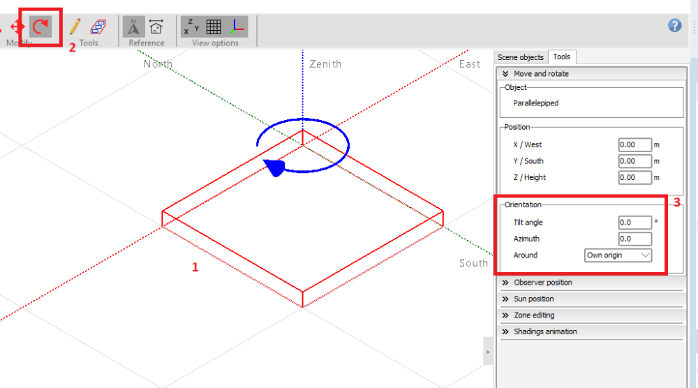 Dear Michalis, After adding the object to the 3D scene, you can select it, then click on rotate icon and set its tilt and azimuth as shown below: Regards