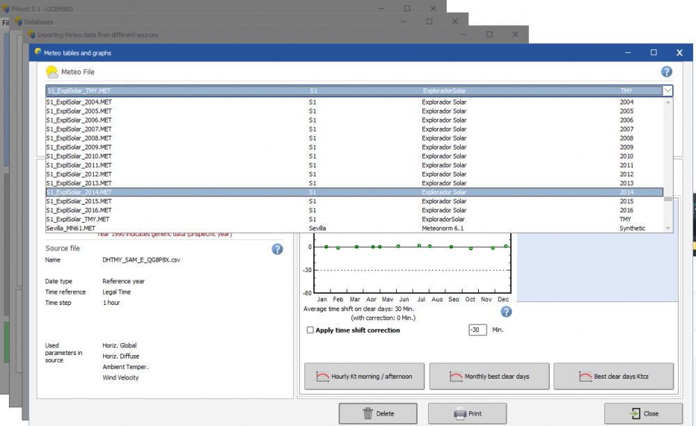 3. Dear soojin, The import worked correctly, what you imported was the multi-year hourly time series, which means every year is imported into separate .MET files (the one you have in your project is the last one for 2016). You can see in the screenshot below that the import creates 13 files for 2004 to 2016. This is done because PVsyst only simulates a single year of data. If you want to use all 13 years, you can look into the Aging tool or the Batch simulation. If you want a single file that represent the average for your place, you have to import the TMY with Sam format, see below for which source to chose. Regards, Lazare