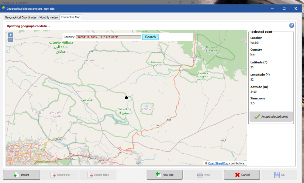 1. Hi, I was able to use google coordinates with interactive PVsyst map in Degre, Min, Sec. format. However, with the latest update (around 2-3 weeks ago) the interactive map is not giving the right location.