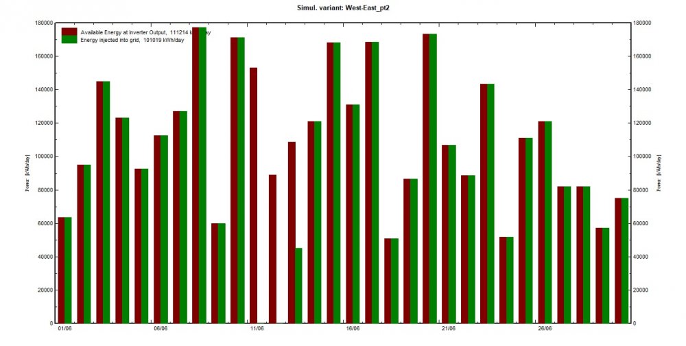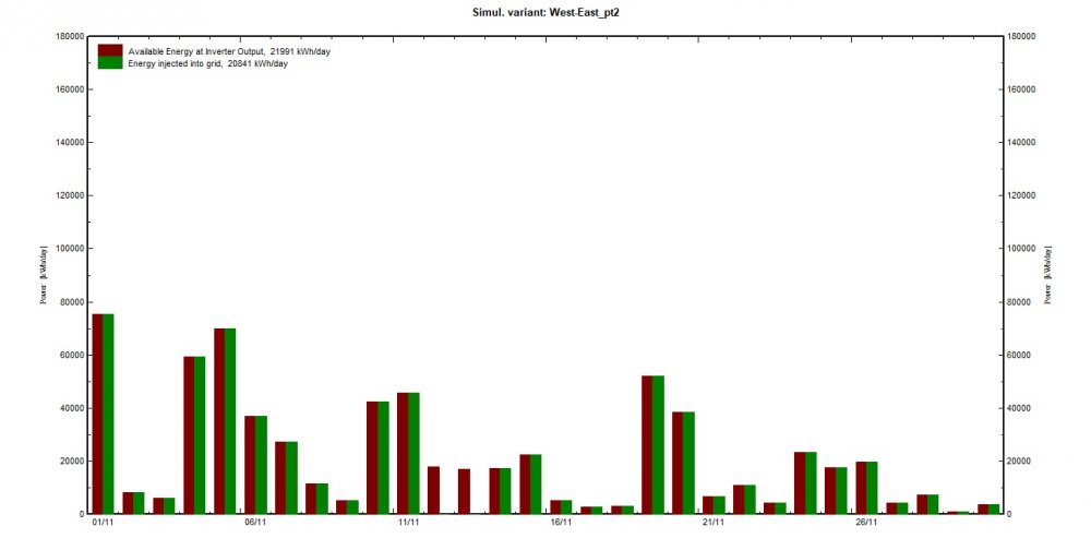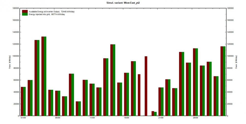 Hello, My name is Tayzer and I'm doing a project inside PVsyst using the site file "De Bilt", and after the simulation, I went to Detailed results --> Daily graphs --> select the "Available Energy at Inverter Output" and "Energy injected into grip" appears the picture attached. I got stuck to understand why I have some days in June, September and November without values on the Energy inject to the grip as usually have the same value as the "Available energy at inverter output", does anyone knows where I can find information on PVsyst about this missing values. Thank you so much. The month of June with the missing information from day 11th till 13th The month of September with the missing information from day 18th till 20th The month of November with the missing information from day 12th till 13th