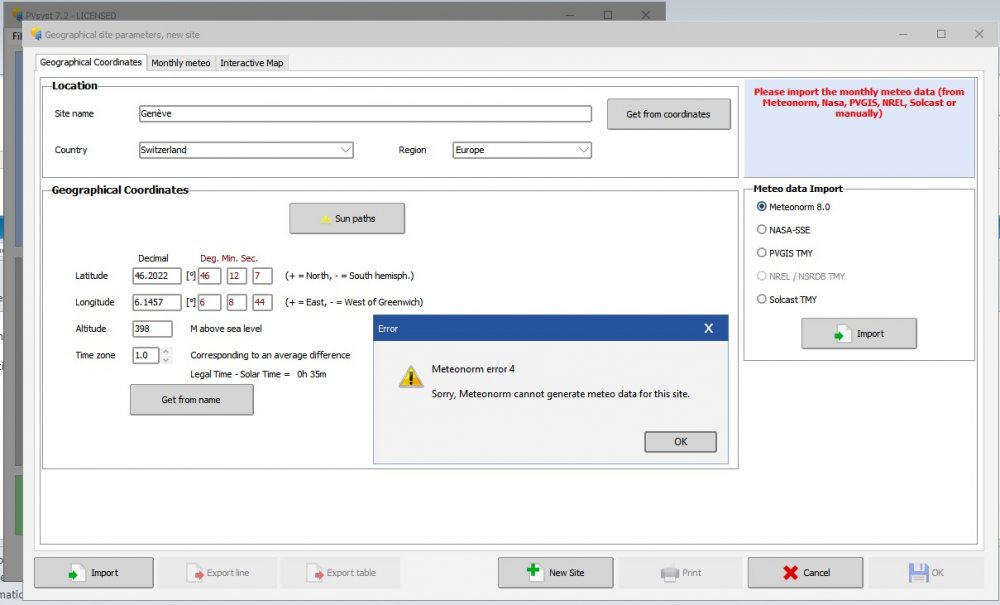 Hello, After the recent update to PVsyst 7.2.4, I am unable to import the new meteonorm 8.0 data for any given location getting Meteonorm error 4? How can I import data for any lat./long. in the new update? Previously I used to input Lat./Long. for the given location in the interactive map and then choosing meteonorm 7.0 and click import. While it works with meteonrom 7.0 in the previous PVsyst 7.1 version the new update doesn't allow importing of meteonorm 8.0 data. Please see the attached screenshots for the error window.