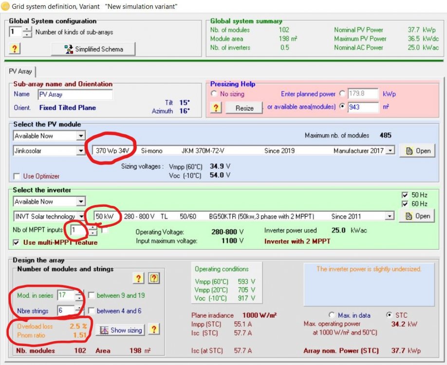 I use the solar panel "Jinkosolar 370W" and inverter "INVT 50kW with 1MPPT" The design layout consist of 17 panels connecting in series and 6 strings, which result to total panel of 102 panels. The expected total power output should equal to 37 kW ( total power = 370*17*6 ) However the result of PVsyst shows the "Overload loss" notification.  My Questions are:  1: Why is there overload loss notification in the PVsyst software(I think that the power output 37kW is still below the selected inverter of 50kW)? 2: When I increase the MPPT number, why the overload loss also reduce?  This photo represent the design project