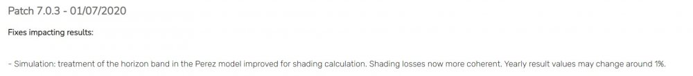 3. Good evening, I have a question about the treatment of the 3rd component "horizon brightening" of the Perez model for what concerns the shading, as reported in the release notes on the website. Is it treated like the beam/circumsolar components (purely geometric-analytic shading factor varying with sun position and calculated dynamically) or like the isotropic diffuse/albedo component (constant shading factor depending only on the system's geometry)? Or even, as it's coming from the horizon, in the case of multiple shed rows, is it null except for the first one? Hoping someone may answer my question, Thank you Best regards, Michele