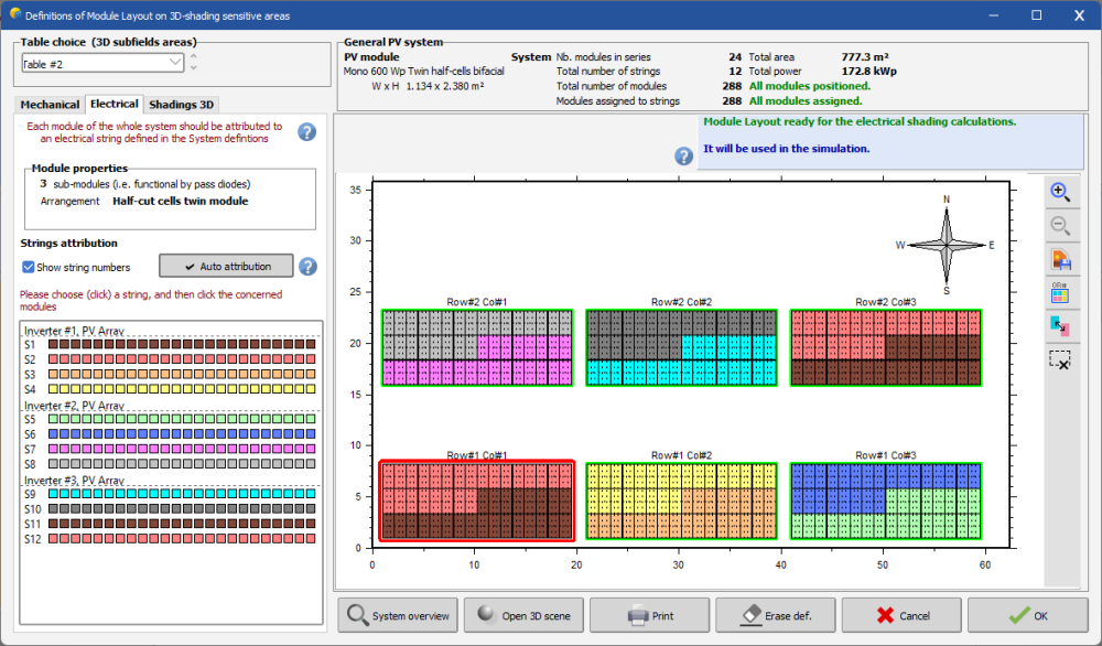 Half-cut cell modules in portrait, strung in U (2TU) have: - Partitions in y = 2, partitions in x = 1 For wider tables which are 2 strings across (26 = 2*13) still strung in U: - Partitions in y = 2, partitions in x = 2 https://www.pvsyst.com/help/shadings_partitioninstrings.htm