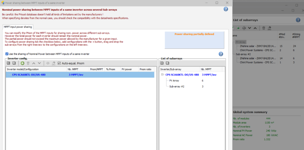 I have an issue with MPPT power sharing. each inverter has 3 MPPT inputs. there are 3 inverters total and the MPPT breakdown is this for all 3: CHINT CPS SCA60KTL-DO/US-480V MPPT #1 = 4 strings of 15 mods per string (540W module) MPPT #2 = 4 strings of 15 mods per string (540W module) MPPT #3 = 2 strings of 14 modules per string (540W module) Remember there are 3 total inverters so I have a total of: 24 strings of 15 mods per string 6 strings of 14 mods per string PVsyst is not letting me power share correctly. it is not giving me the option. I have experience with power sharing in the past, but i cant get to the screen that lets you move around the strings on each inverter. Thanks for your help!