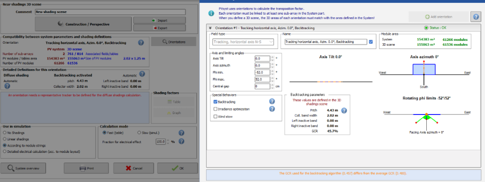 hey guys, I need to know if a 120 degree tracking range correlates with the following pvsyst Orientation input --> Phi min -60deg , Phi max 60deg. I feel like it this isnt correct. PVsyst seems to be measuring from the horizontal and looks to have a shallow tracking range when +- 60 deg is being used for Phi max and min. For example, a +- 52deg tracking range is actually steeper on pvsyst than +-60deg tracking range. Thank you!