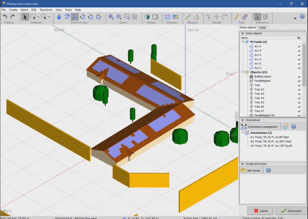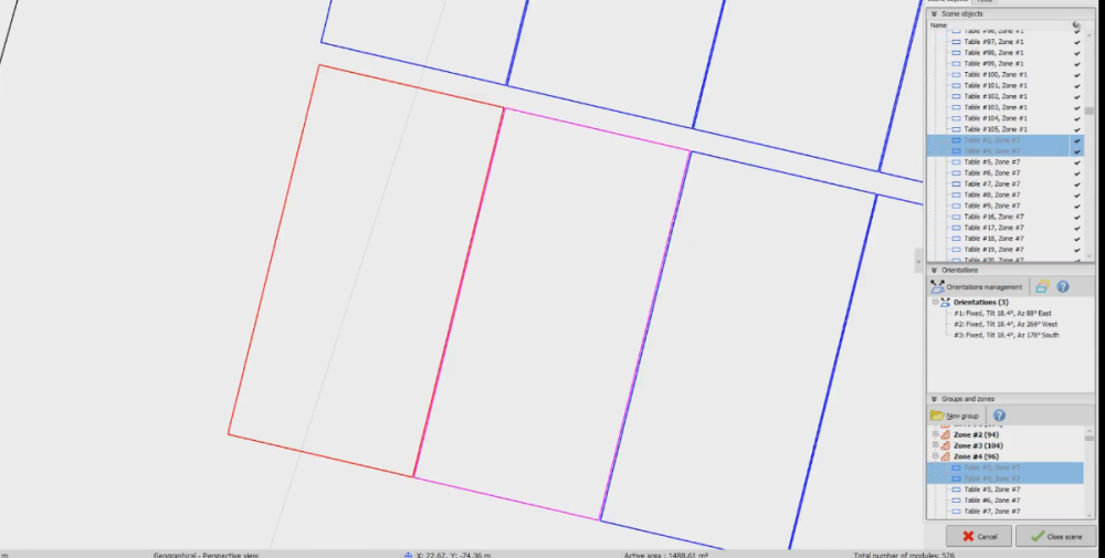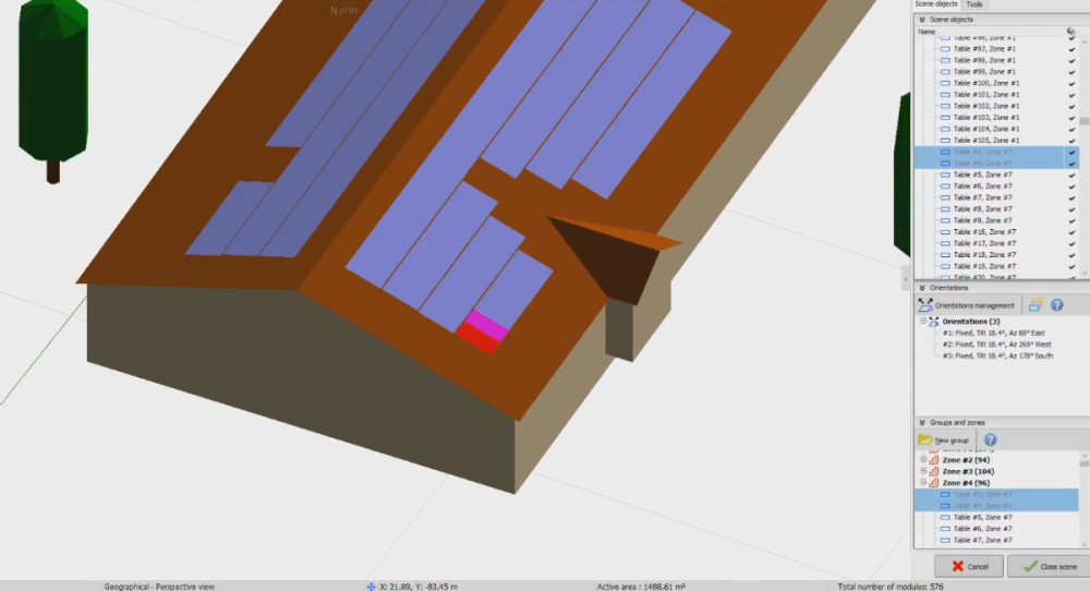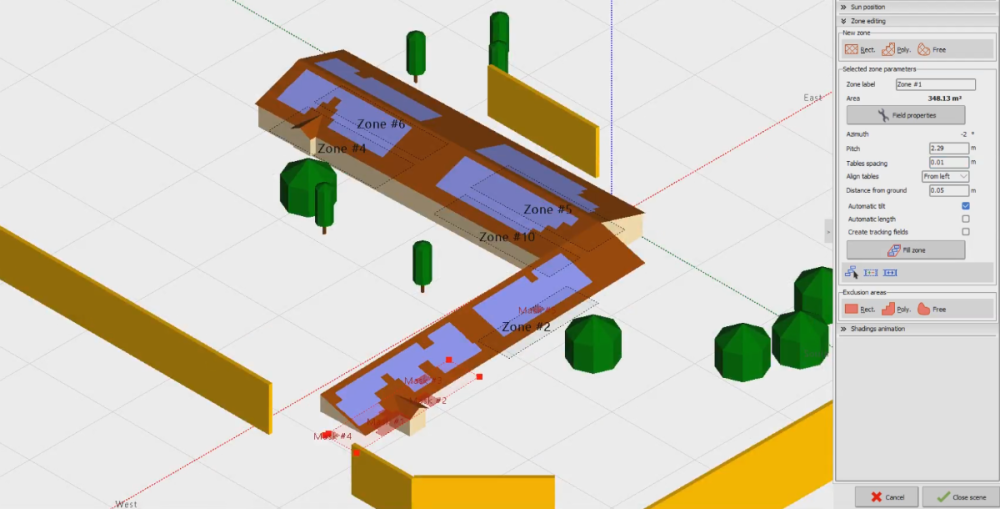 dtarin, Thanks for that suggestion, I have since updated the model using zones, selected auto tilt, adjusted the spacing between modules to 0.009m (0.375" for module to module gap. I found it easier to forgo the masks for most of the design and just deleted the modules away where necessary. When leaving the shade scene I get the following error: PV field is confused with, or very close to the object. I do not have other shading objects, the fields are all above 0.05m (so as not be be obstructing with the roof) This was setup using auto fill with my spacing of 0.009m module to module gaps, but is this too small for PVsyst? What options do I have so as not to give bad bifacial gain representation between the module gaps and such? Thanks again for the help! Kind Regards, Mike