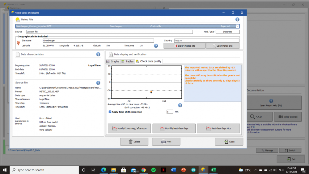 Hello everybody, In the picture below you can see 2 graphs. The left one is the outputpower of the inverter MEASURED, the right one is the ouputpower of the inverter SIMULATED. It is clear that on the left, the inverter goes 'clipping' at a value of 8kW, why doesn't this happen when simulated in PVsyst? Does this have anything to do with the overload losses?
