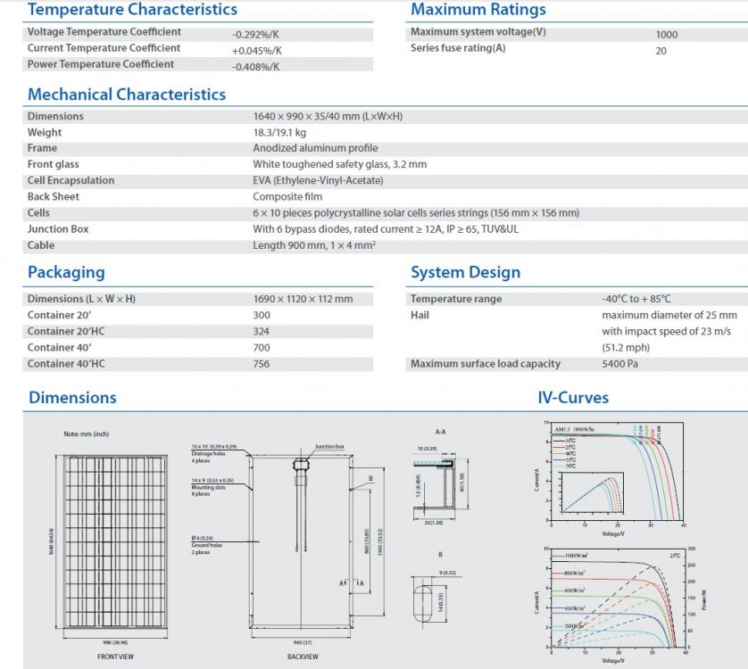 Dear all, I want to modelize PV sheds with this layout: PV panels in landscape, tables of 4 rows, strings connected on a unique row. How shall I define the electrical effect ? These cells are defined as follows, cf. the enclosed datasheet: - 6 × 10 pieces polycrystalline solar cells series strings - With 6 bypass diodes Shall I define only 4 strings in the width of the row? Or 4*6=24 strings in order to account for the bypass diodes (the layout can be considered as linear)? Thank you for your help Best Regards Christophe