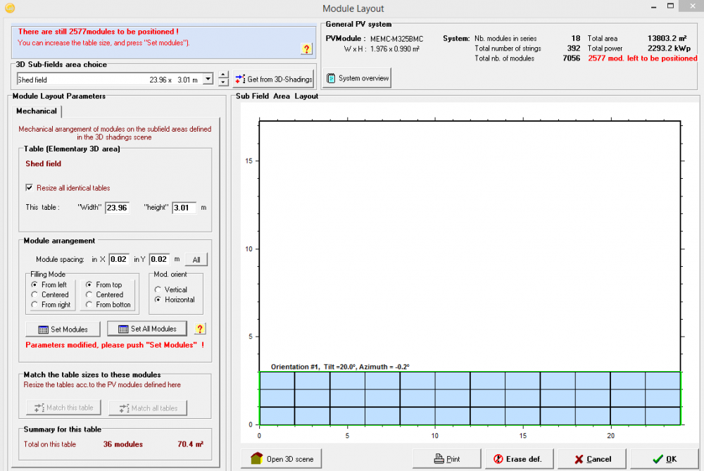 I'm trying to apply the same spacing and orientation to all identical tables in the Module Layout section. However, it does not work and the help file does not provide sufficient detail for me to troubleshoot. Placing all of the modules table by table would take hours. Whereas, if this worked, there are only 3 table types to configure. My current process is as follows: 1. Open module layout. 2. Select the spacing parameters. 3. Press 'All' 4. Select the orientation and filling parameters. 5. Press 'Set all modules' (I have also tried 'Set modules' and then 'Set all modules' but neither work) Sometimes, after pressing 'Set all modules' the number of unassigned modules actually increases! Is there something I'm doing wrong or is the program not functioning correctly? Module Layout Screenshot Near Shadings Screenhot