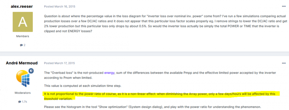 2. I have 42MW array PV however i only have 30MW Inverters, which means Solar Farm generated more Energy than my Inverter can handled (Inverter Clipping) In Diagram Loss from Pvsyst only shown -0.3% "Inverter Loss over Nominal INV.Power" , however from my yearly-monthly-daily calculation the loss from this "Inverter Clipping" can cause from 5%-11% depend on how much irradiance which happen at that day. I wonder whether the "Inverter loss over nominal INV Power" is the same as the losses of "Inverter Clipping", since the number of % is mismatch. and whether PVsyst can forecast the losses due to AC/DC ratio or Inverter Clipping in order to us to get suitable PR Performance ?