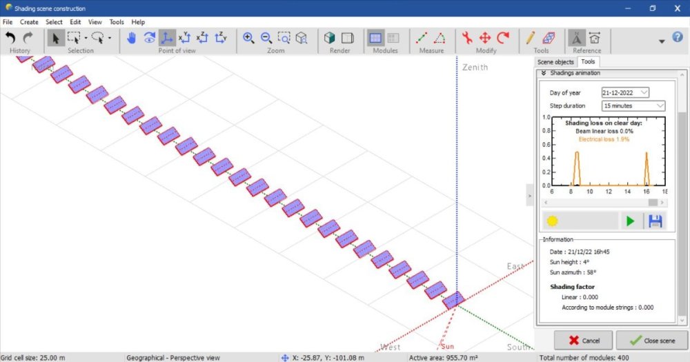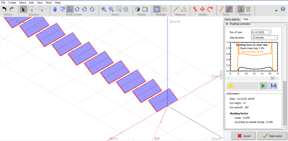 In shading animation is showing linear(7.6%) as well as electrical losses(39.3%) but the shading scene is not showing the occurence of shade on the table (Yellow/Grey).Also is the linear and electrical loss indicated is instatenous loss for an hour or a total loss for a day (21-12-22)? Does the shading factor tables represents a particular day (21-12-22) or its gives the total/Average loss for the entire year. Can the shading table loss (linear)be converted to equivalent electrical loss values. The azimuth in the shading factor table represents the azimuth of the solar panel or the solar azimuth angle( east -west).