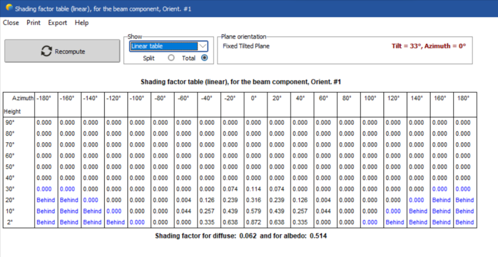 Thank you for clarification. Just looking for further clarification here 1. Since the values are avialble in 10/20 deg interval , how do we see the value at say 20 deg height .Is it the instaneous value at 20 or it is average of the values between 10 and 20 deg for any particular azimuth angle. 2. Does 'temporality' means the shading factor table is generic. Say for the value of 10 deg height and -20 deg azimuth (just before noon) the shading factor has some value which has no significance since towards noon sun height would always be altleast greater than 10 deg.Please correct me here.(I understand Iso shading diagram gives the location specific shading impact). 3. How do we interpret the single value of shading factor for diffuse and albedo at the end of the table.Does it represent avg value for all sun position in year.