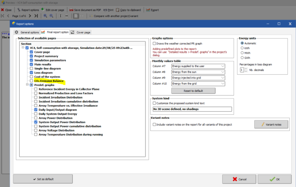 You find the carbon balance tool in the end of the economic evaluation window and you can choose to print the results in the report. In the report option, make sure the Co2 Emission Balance is enabled for the results to appear in the report.