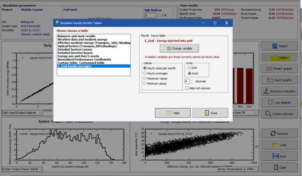 Hello, After running a simulation you have access to the "Detailed Results". In the "Tables" window, you can generate a table like the one in the beginning of this thread with E_Grid hourly averages