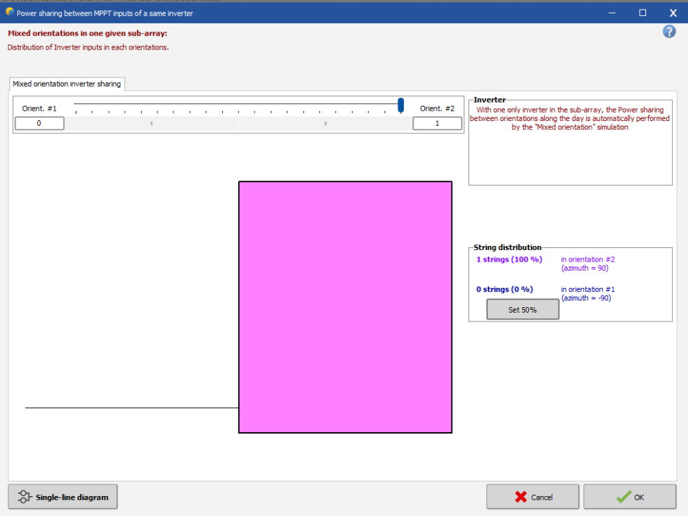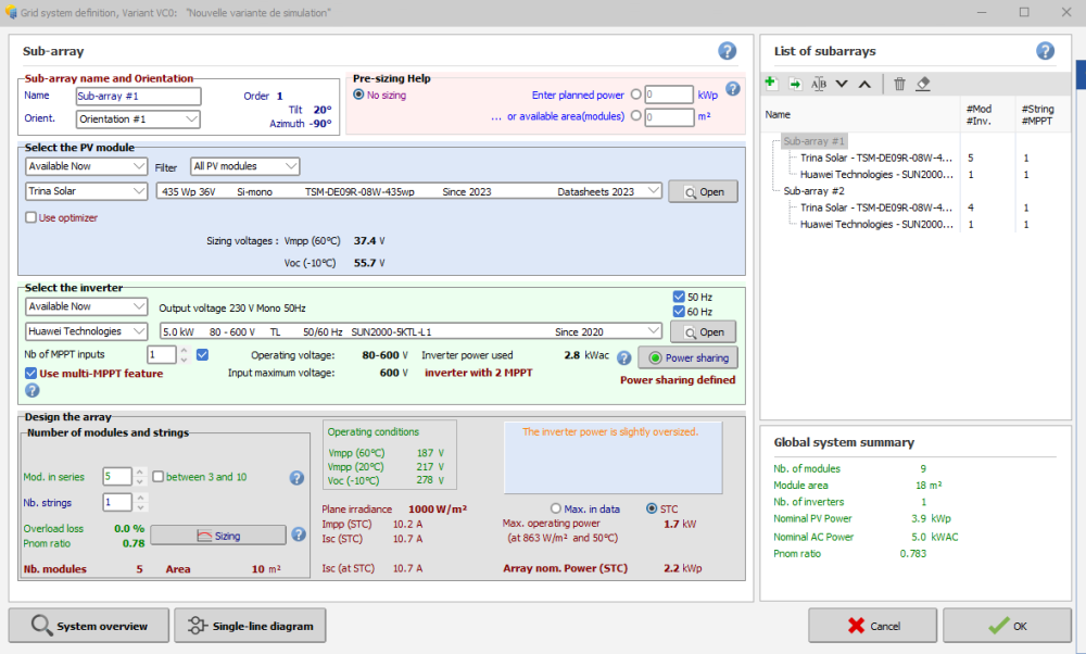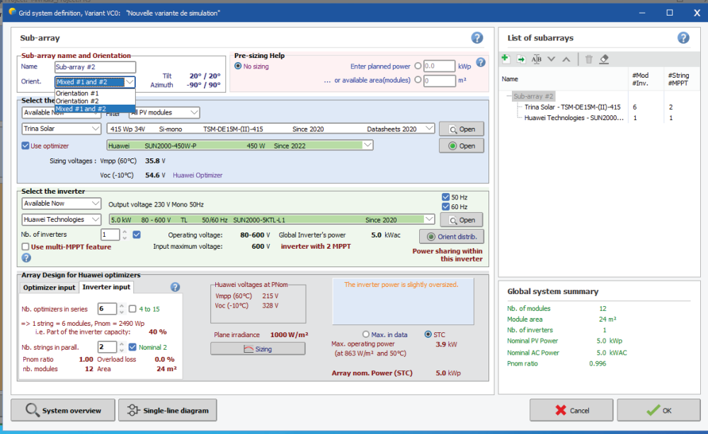 Dear Michalis, I am not completely sure what it is that you want to do. Though, by creating two subarrays, one for each orientation, you can use the inverter you mention, by putting one string with for instance 4 panels in one sub-array/orientation and 5 panels in the second array/orientation, a total of 9 panels with a total Nominal PV Power of ~4kWp, using one MPPT for each string and activate the Power sharing. See example below. With an inverter of 5kW and an installation of 4kW, the inverter will be slightly oversized. Regards