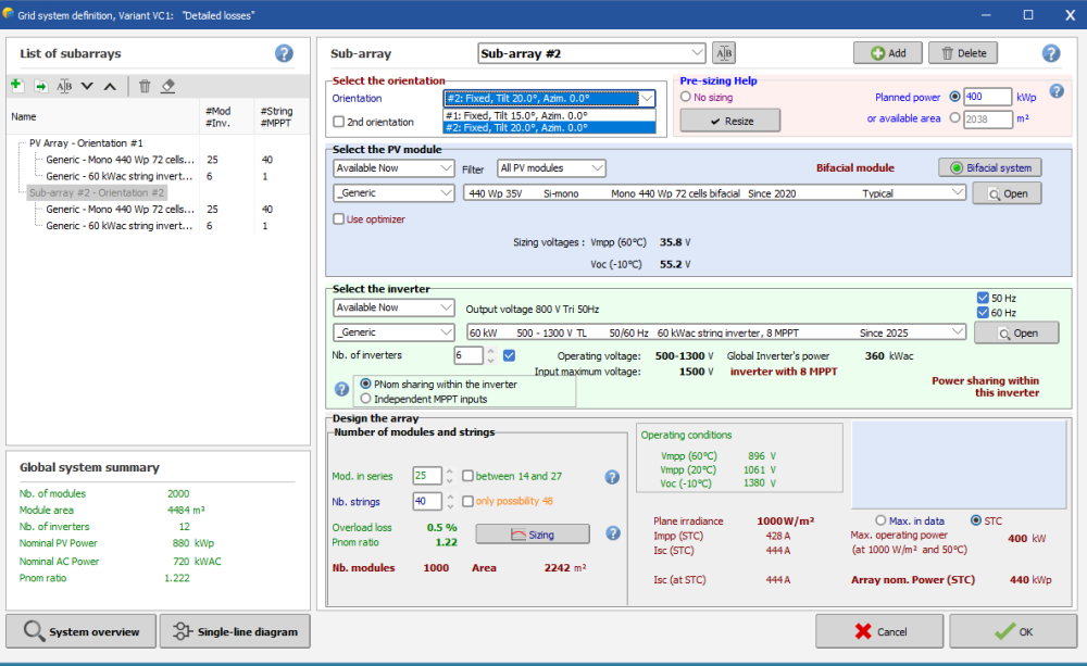 Hi, Indeed you should check the multi-MPPT feature and click on the Power sharing button to activate the power sharing feature (drag the sub-array from the list to the right to the configuration to the left). By defining this correctly, it would be expected to decrease the overload loss over nominal inverter power.
