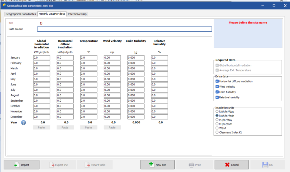 Hello Kadi1, Indeed the simulation will be done for maximum a year, thus the weather data can not contain data for more than a year. The simulation will be done with hourly time steps, so to use the custom file you need to have hourly values. Do you have daily averages? You could possibly create monthly averages based on all the years of data that you avail, and create a synthetic data file based on the monthly averages. This can be done but creating a new site and fill in the Monthly weather data: -
