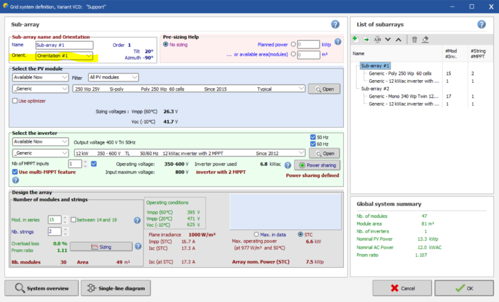 10. Hello, First you define your different orientations using the field type multiple orientations in the Orientation window. In the system window you can create multiple subarrays (see the List of subarrays to the right) and assign each subarray to an orientation (see the list of orientation that you have defined previously, in the Sub-array name and Orientating angle, orientation highlighted in the print screen below). If your inverter has multiple MPPTs input, you can activate the Use multi-MPPT feature and assign a number of MPPT inputs to each sub-array and use the Power sharing feature for sharing of Nominal Power between MPPT inputs of a same inverter. You can find more detailed explanations of the MPPT feature and Power sharing in the following help pages: https://www.pvsyst.com/help/multi_mppt_use.htm https://www.pvsyst.com/help/powersharing.htm https://www.pvsyst.com/help/multi-mppt_more-examples.htm Kind regards