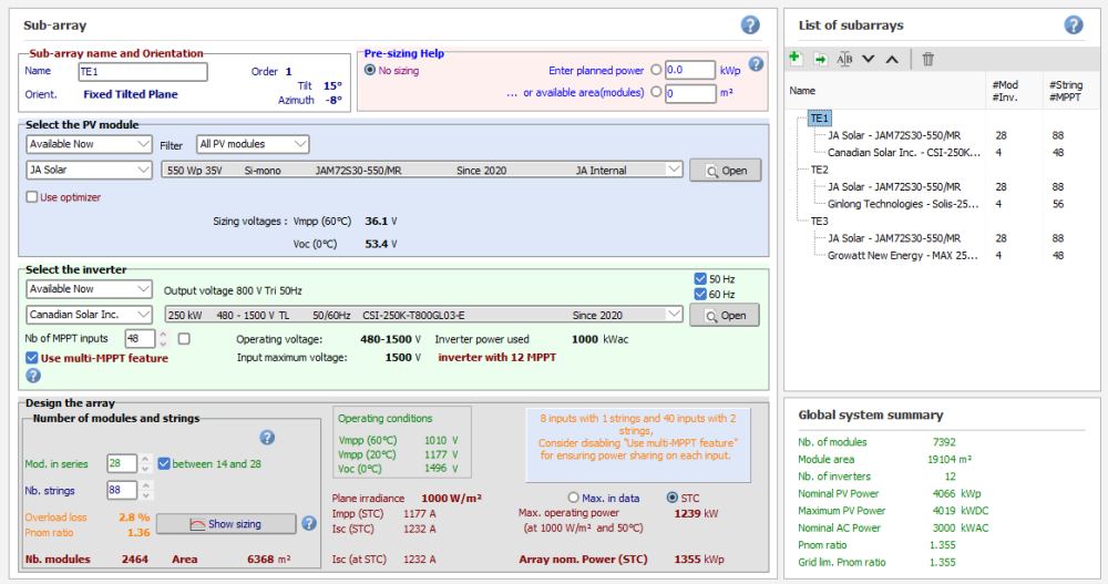 I've ran two simulations, both of them are a 3MW (12 x 250kW inverters) and 4,066MWp array, two different sites. The first simulation, let's call it Plant 1, I got the value of -4,06% Inverter loss due to nominal inverter power. The second plant, Plant 2, with the same inverter and array configuration, I got the value of only -1,82% loss. Plant 1 Plant 2 When I spotted this difference I figured it could be due to the respective plant sites, which are distinct. So I inverted the sites in both simulations, but it didn't make much of a difference: It's noticeable that the inverter temperature loss changes properly, but the inverter loss duo to nominal inv. power is about the same. Plant 1 - Inverted site Plant 2 - Inverted site I can't figure out what exactly is causing this Inv. loss duo to nom. inv. power, but it's certainly about each simulation's parameter. Can somebody help me with this issue? What parameter could be causing this significant difference?