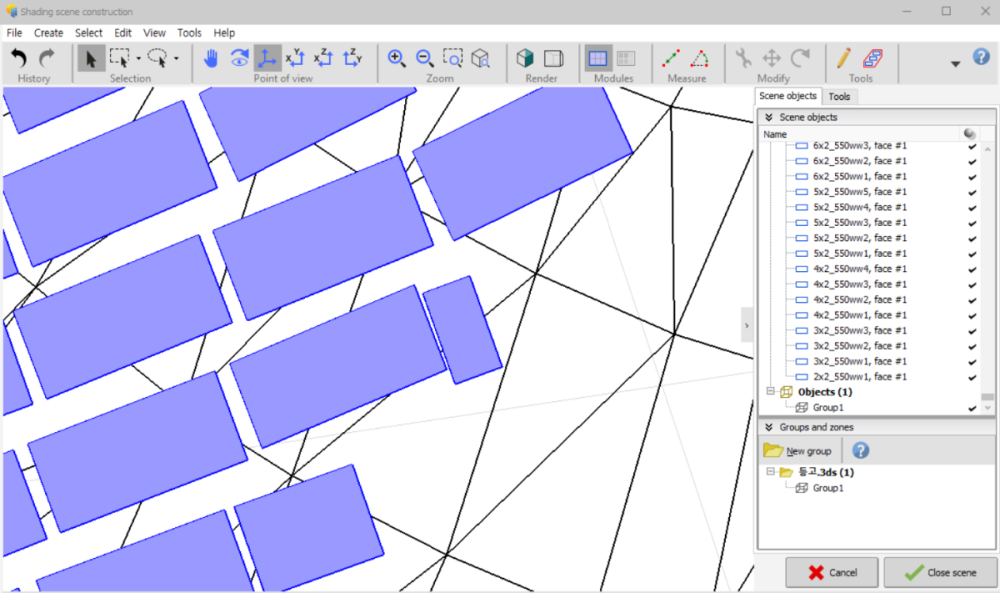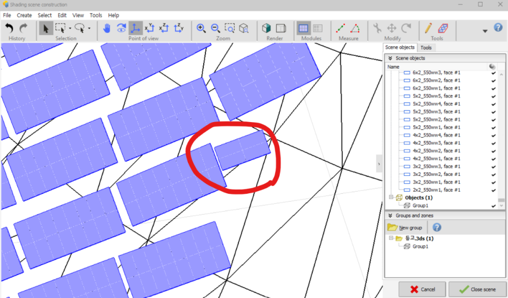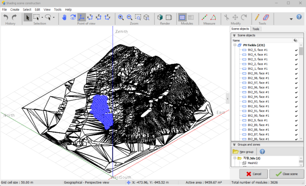The topography was drawn in the sketchup and the module angle was arranged equally at 18 degrees