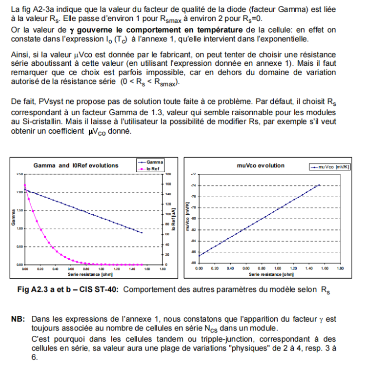 PVsyst détermine par approximations successives la valeur maximale de résistance Rs qui permette encore à notre paramétrisation de passer par les 3 points. ....................De fait, PVsyst ne propose pas de solution toute faite à ce problème. Par défaut, il choisit Rs correspondant à un facteur Gamma de 1.3, valeur qui semble raisonnable pour les modules au Si-cristallin. Mais il laisse à l'utilisateur la possibilité de modifier Rs, par exemple s'il veut obtenir un coefficient μVco donné.'