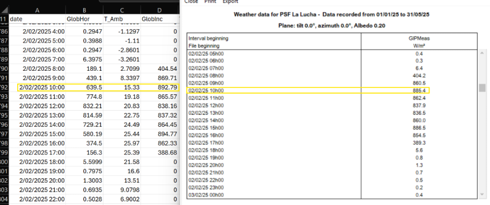 Hi everyone, I've noticed something curious while working with a custom .MET file that includes field-measured irradiance in the plane of array (GIPMeas). After running a simulation and generating the 8760 output file, I've seen that the GlobInc values sometimes differ from the GIPMeas values input. I understand that GlobInc represents the global irradiance on the plane of the array, but I was expecting it to match the GIPMeas data directly, since that's what I used in the .MET file. I’m attaching a screenshot showing a comparison between GIPMeas and GlobInc for reference. Does anyone know why these differences occur? Is there some internal processing or adjustment done during simulation that could explain this? Thanks in advance!