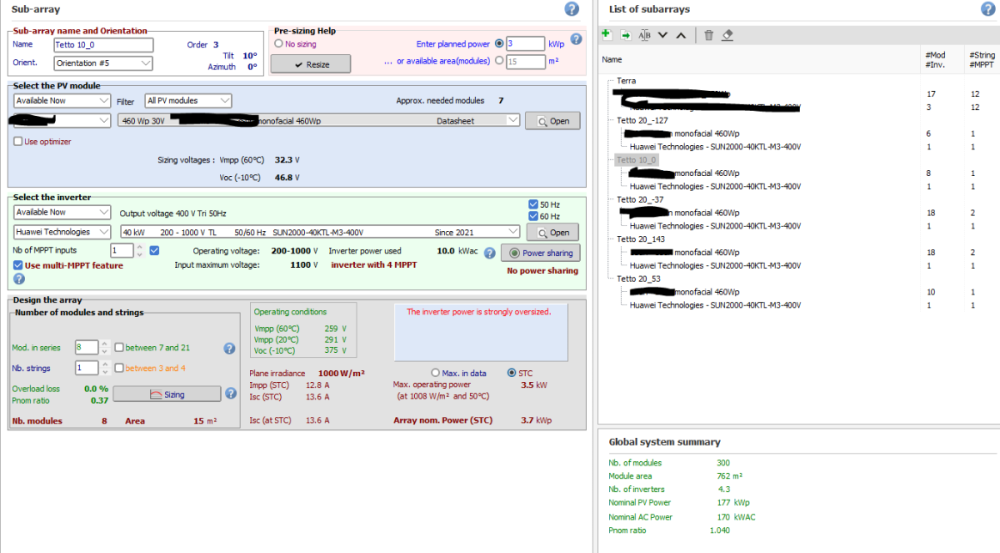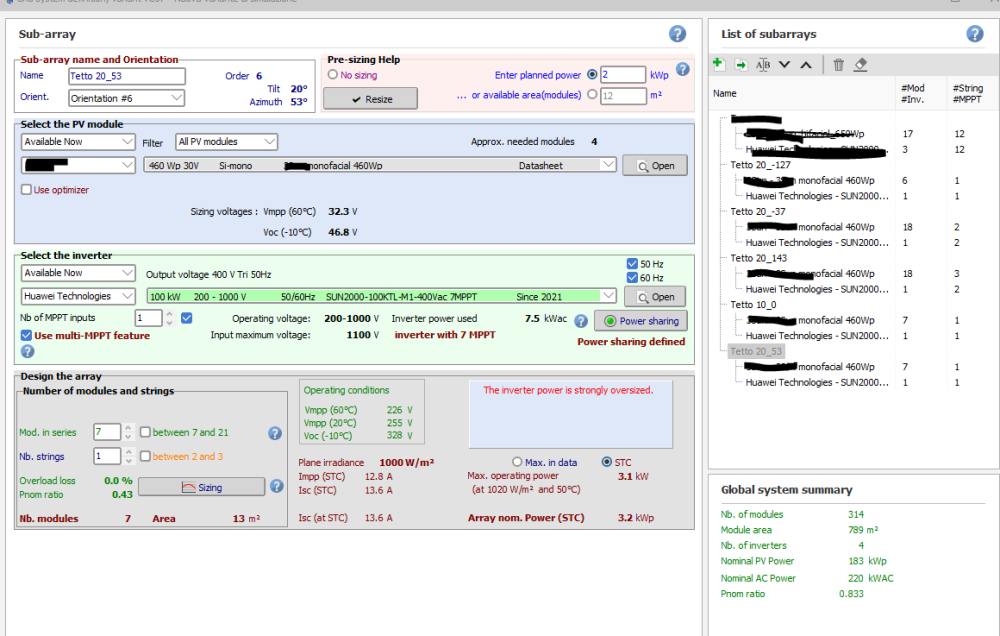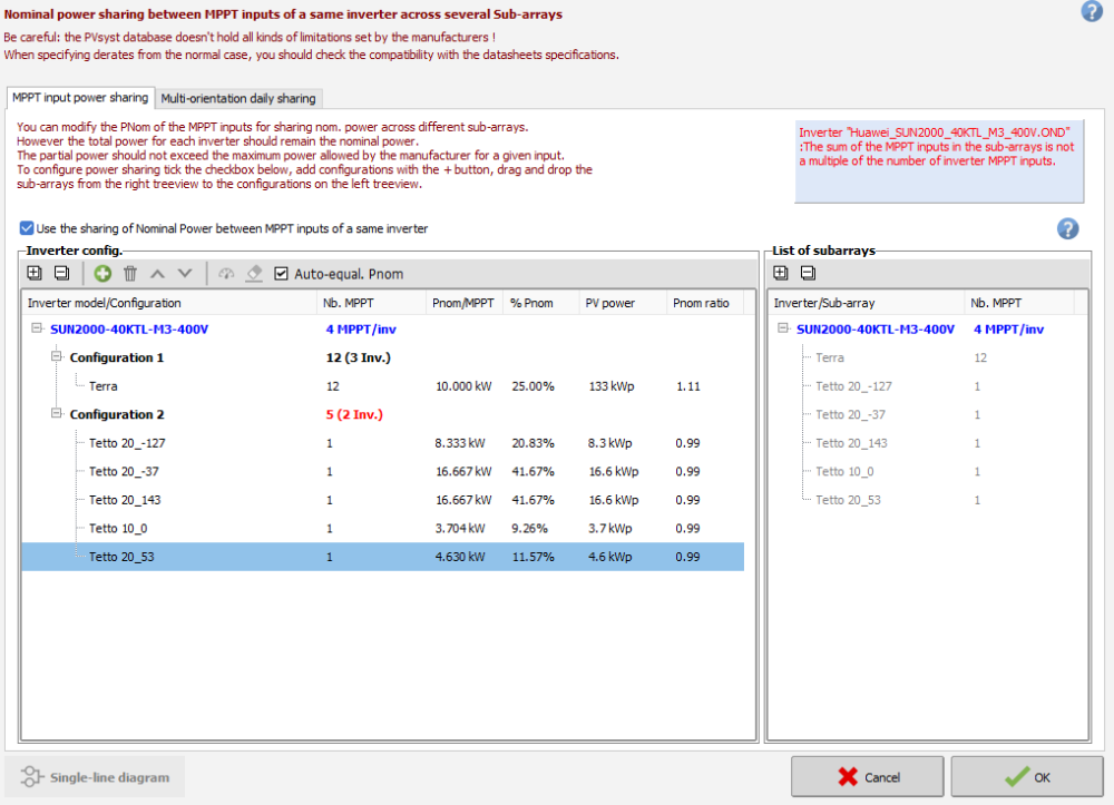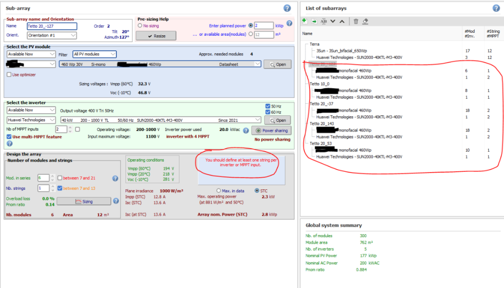 Ok, thanks. I tried an inverter with lower power. Now, the sum of my subfields is 44.16kWp and my inverter is 40kWac rated power. Anyway, I don't understand how to assign the various strings to inverter inputs using "power sharing". Now, I have 5 strings with 5 different orientations, as per attached image. Within red lines the problems I'm facing. Could you suggest any solutions, please? Many thanks