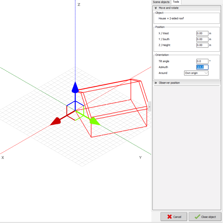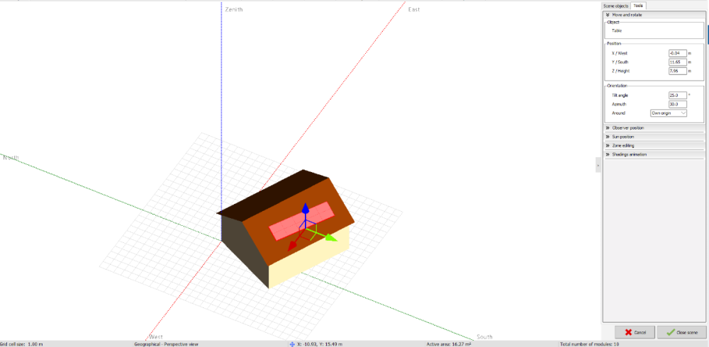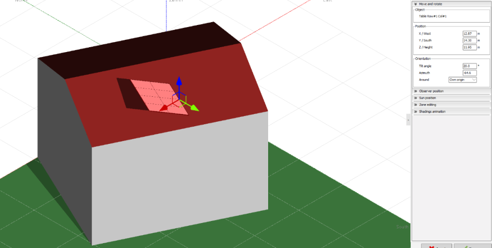 Hello, I would like to ask something about 3d schene and azimuth of pv panels. In one project in which i am working this period, I have a house + 2-sided roof. The plane tilt and azimuth is 25 & 30 degrees, as you can see in first pic1. Therefore, when I draw the house in 3d shene in order to achive that azimuth i define it -64 degress. (pic2) Then i draw the panels with tilt 25 degrres and azimuth 30 degrees, like i defined in Orientation window. (pic3) So, my question is this; The azimuth which pvsyst takes into account to calculate the shadings and production is the 30 degrees that i defined in orientation? And why the azimuth of house is different than the azimuth of panels, since both "face" the sun position from the same position. Thank you in adnance. Sincerely,