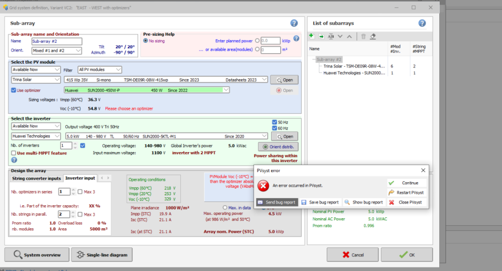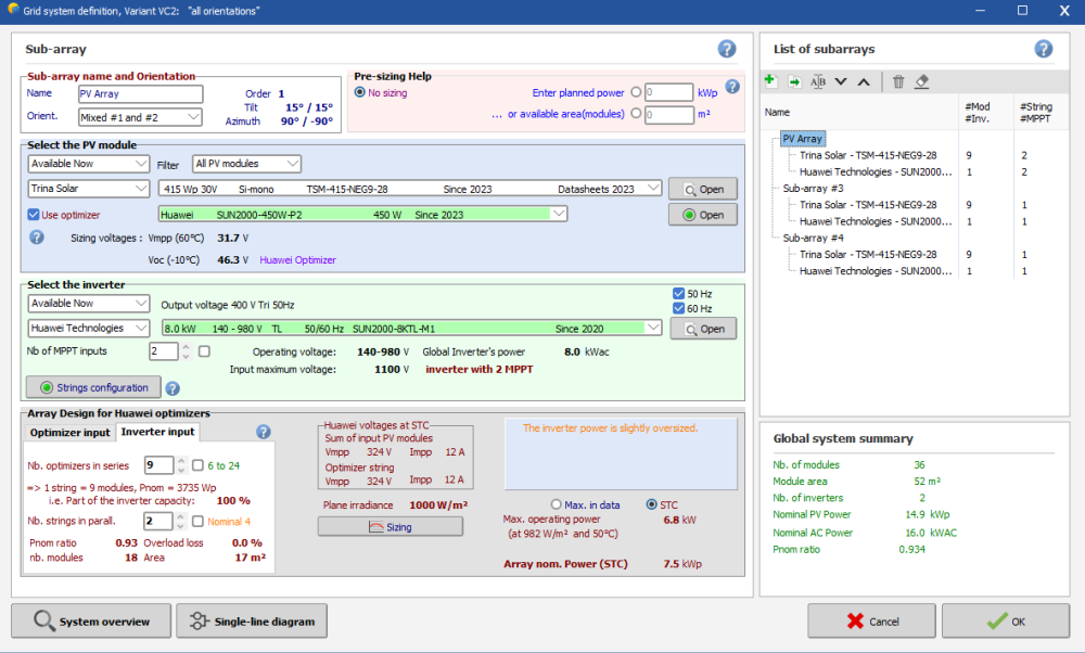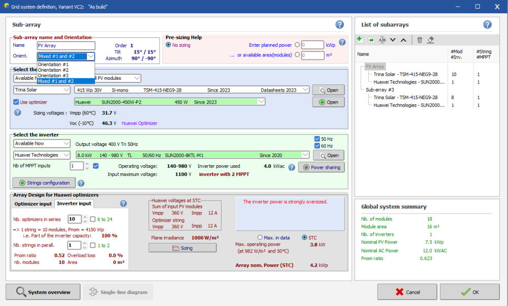 Hello again! I am trying to develop a project with 3 differents orientations. And I face that problem. "The inverter is strongly undersized". However, when I select strings configuration I face another problem, as you can see in picture below. This is problem is due to that i don't use optimizer for this orientation that presented the subarray 3?