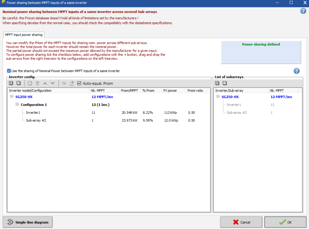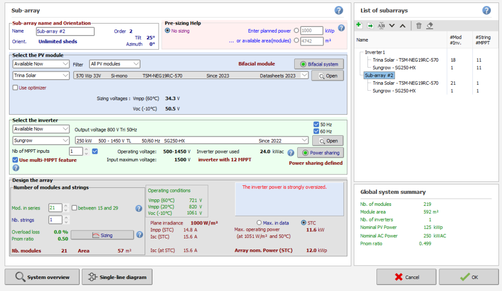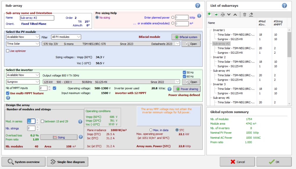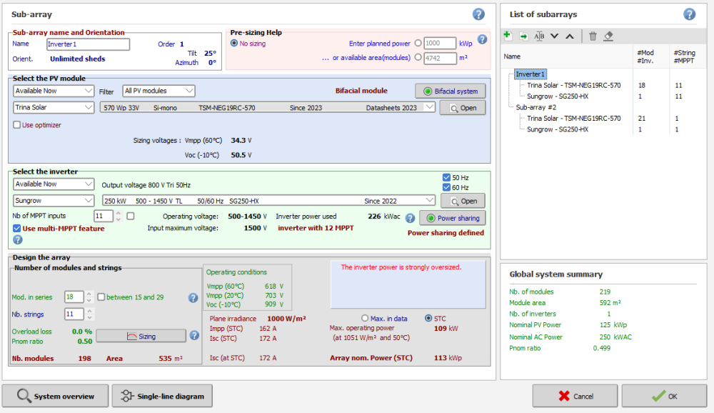 Hello, I would like to ask ho to design a large scale pv system. I am working on a 1 MW (999.78 kW) project. More specific i use 1754 panels Trina 570 W and 8 inverters sungrow 250-HX. I am trying to define the system and i can't to define my strings in programm. I have 7 inverters with 18 panels in series in 11 mppt inputs and 21 panels in series in the last mppt input. And obviously, at 8th inverter i have again 18 panels series in 11 mppt inputs and the last one mppt input has 23 panels in series. Calculations: 18 * 11 + (21*1) = 219 panels in each inverter. These strings refer to the 7 first inverters. 18*11 + (23*1) = 221 panels in each inverter. These strings refer to the last inverter. This scenario, described above i would like to define in programm, but i don't mangage it. Although, the power sharing it's okay the message the inverter is strongly oversized, prevented me to proccess. I use the same panels in the whole system. The reason that i use subarrays is because i try to define my system as i described above. Is there any ohter way to design that system to avoid the solution with subarrays given that the orientation and azimuth stay the same. I attach some pictures from my system in order to help you.