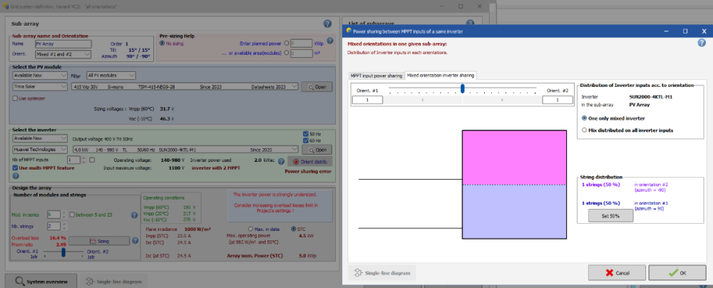 Very well, so with phrase "Mixed orientations can only put different orientation in parallel, not in series" you mean that i can't have a big string in one MPPT with pv modules equal to addition of panels from two orientations. But i can have two seperates strings for each orientation? In this diagramm, I have 4 different orientations, so i have 4 seperates strings. Each inverter have 1 string in each MPPT input. When i try to define the mixed orientation that error appeare. So what is my fault? Maybe I don't understand somethin well enough to forward.