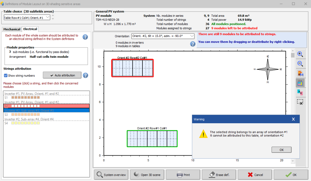 Hello and happy new year! I am trying to attribute some pv panels in a string. And i recieve that Warning "the selected belongs to an array of orientation#1. It cannot be attributed to this tablem of orientation#2". My project has 4 several orientations. During system's definition, I choosed orientation mixed #1 and #2. The rest orientations had taken into account as seperates. How can I solve that error? I attach some screenshot about my project and warnings.
