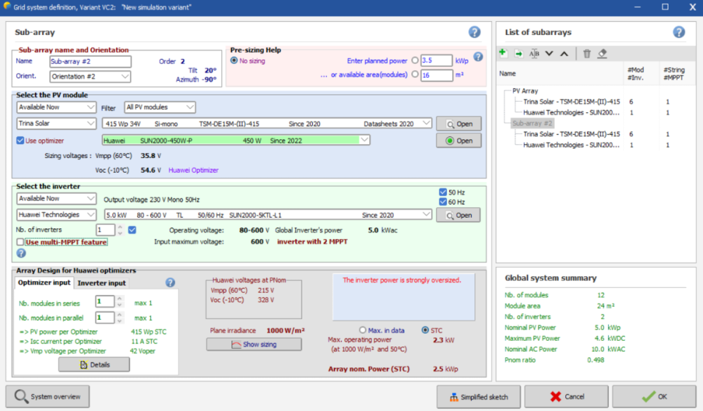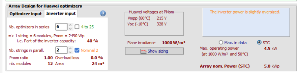 23. Thank for your answer. Furthermore i would like to ask something more. I am trying to simulate an installation (5 kW) with 2 orientations. I want to connect all pv panels in one string in one mppt input. I want to check the efficiency of my project using optimizers, in two tiled roof installation. If I uncehck use multiple mppts inputs the system warning about the inverter is strongly undersized. Can you help me?