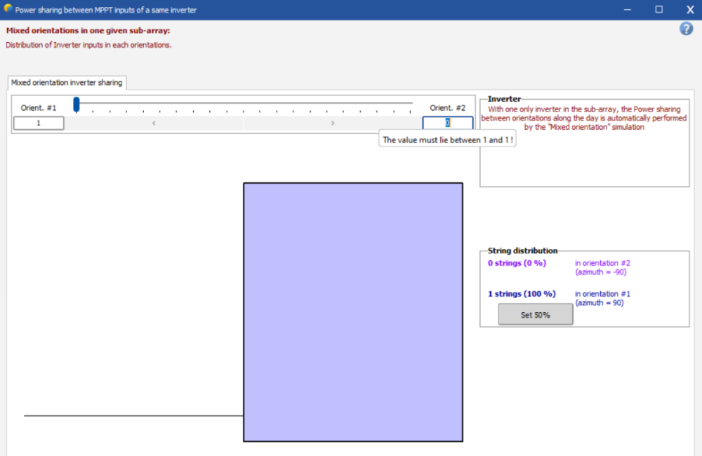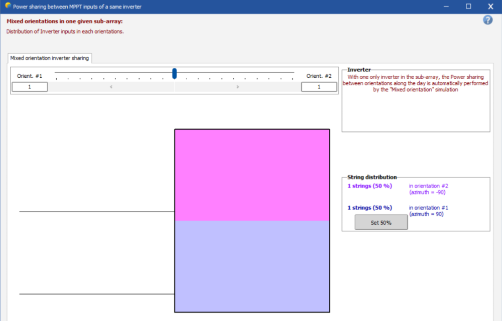 15. Dear Linda, In this case. I have 2 orientations. I use the Orient. Mixed #1 & #2. I have one inverter with 2 MPPT inputs. With option Nb. strings in parall.: 2. That it means, I have two strings parallel in one mppt input? I ask this because, in orient distrib., I have that. And I am confused, because of the fact we can't to define pv modules in series with several orientations, in one string. How that is possible? And how the option Orient mixed #1 & #2 work? Thank you!