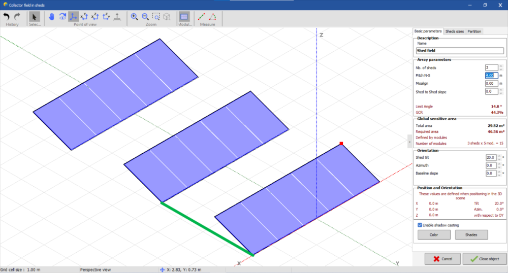 4. Hello, i would like to ask about shading scene. The distance (to this example 4 m) that named pitch N - S between 2 tables of panels is that I noted with green line, in below picture?