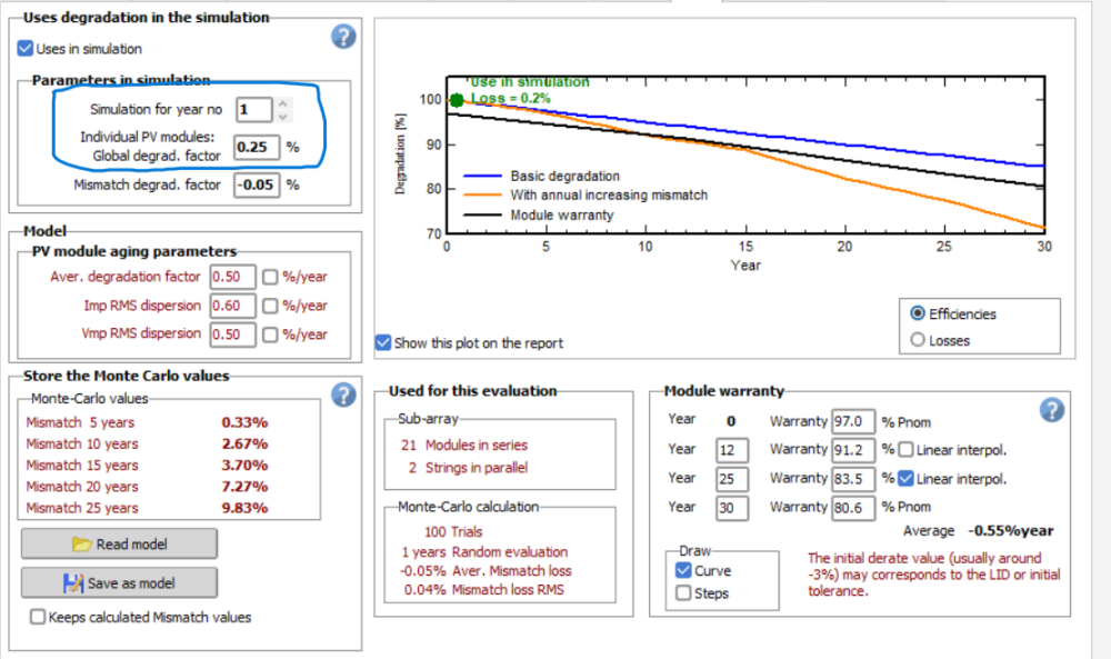 Hello again, I want to ask something else. In this period i am simulating a forecast production for 20 years. Should i define the global degradation factor on Pmpp equal to 0.4% / year ? I am asking because i think that value is important for a forecast analysis? Thank you!