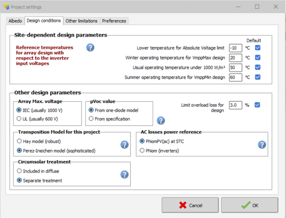 Hello, I want to ask if I should change the parameters in Design Conditions dialog, according my installation area or should keep them as default. Also, how these parameters affect the simulation report and results?